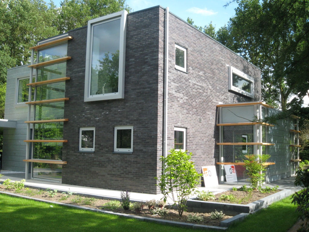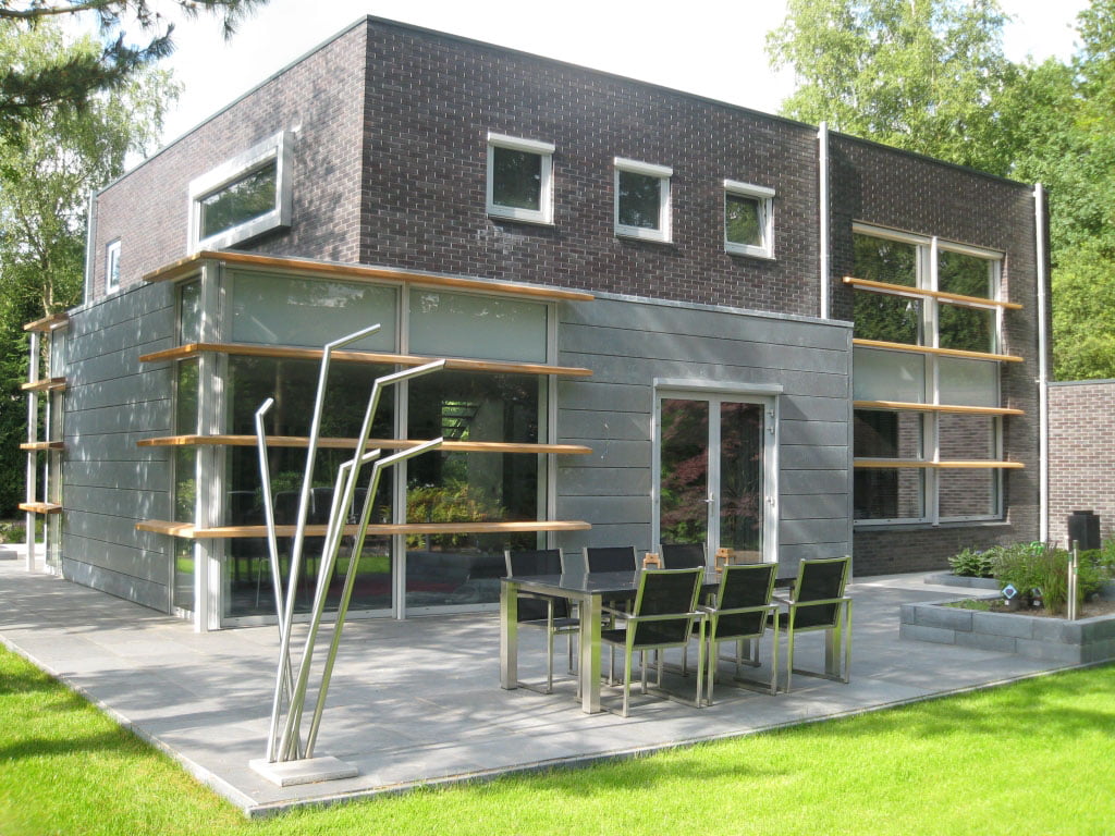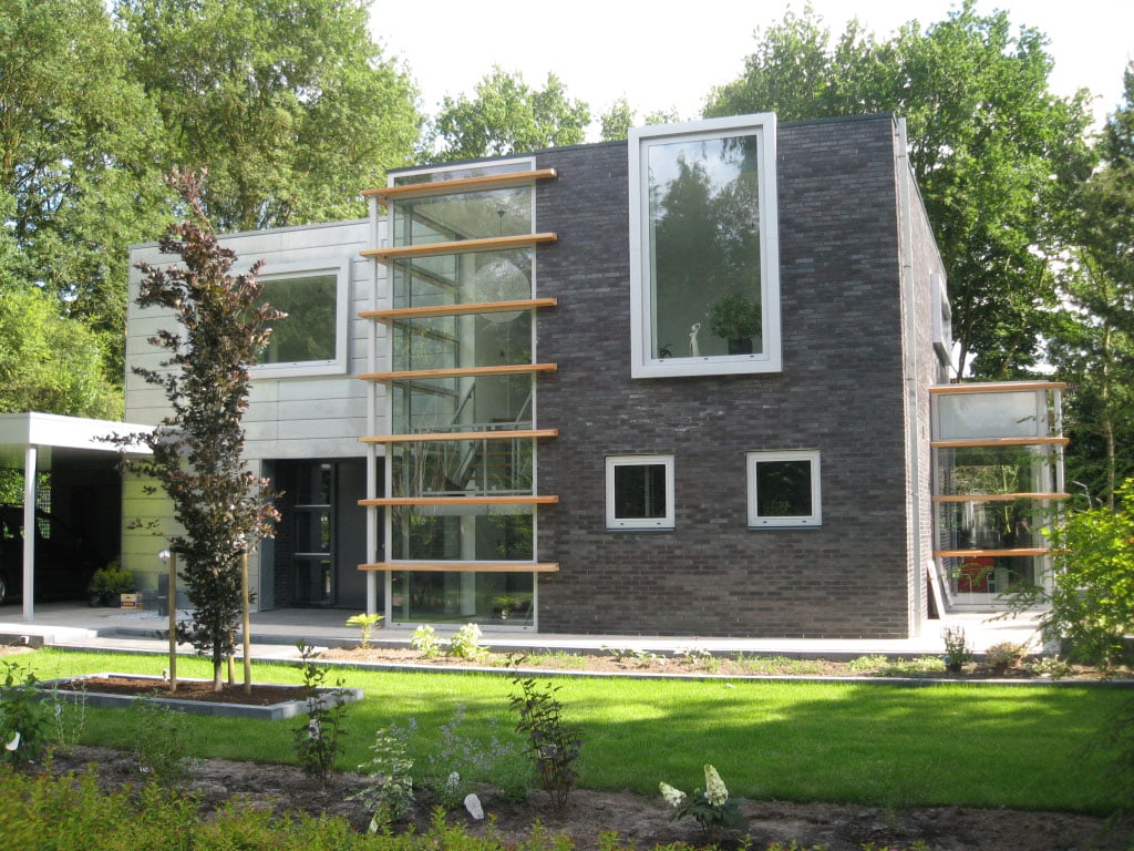 Deze moderne kubistische woning staat in Rolde. De woning valt op door het bijzondere materiaalgebruik: een strakke, zwarte baksteen, zinken bekleding en veel glas.