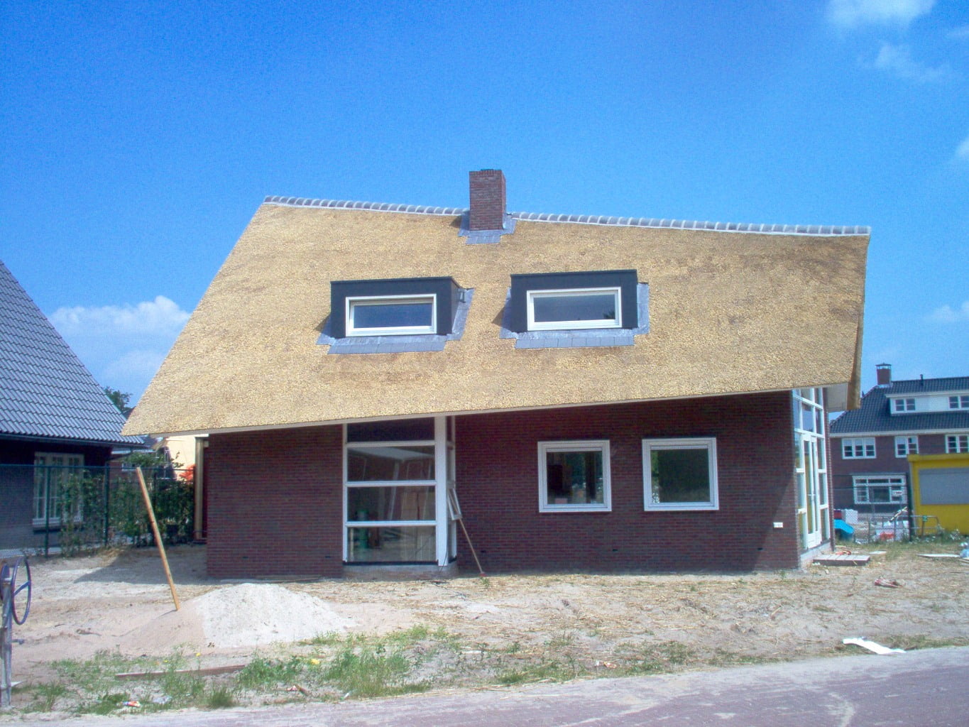 Deze moderne rietgedekte woning staat in Laren. De rieten kap is hier een echte blikvanger, deze loopt namelijk in geen enkele richting parallel. De kopgevel van de woning is transparant door de glaspui in de gehele gevel.